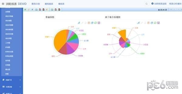 润乾报表不需安装控件,可以实现纯 HTML 报表方式,可以支持 PDF, EXCEL 输出,提供了全部的页面与打印控制,能很多地满足 Web 报表的展现需要。同时,润乾报表对图表有良好的支持,可以生成柱图、饼图、折线图等十几种图表。