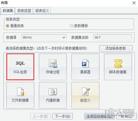 这里我们用demo数据源,制作一个普通报表,如上图所示选择报表类型,数据源和数据集类型、数据集名称可以默认,也可以自定义,选择完以后,点击【下一步】,通过向导编辑SQL数据集。