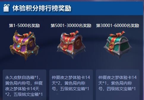 永久皮肤自选箱*1,黄色局内称号,仲夏夜之梦体验卡14天*2,五级铭文宝箱*1