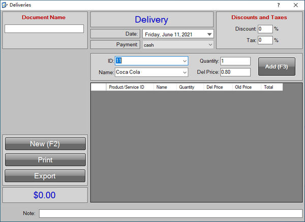 在主屏幕上,您可以访问进行交货和销售的表格。交货和销售形式几乎相同。准备好交付或销售时,请单击“新建”按钮或按键盘上的F2键以将操作保存到数据库并开始新的操作。使用“导出”和“打印”按钮,您可以将操作导出为网页或进行打印。