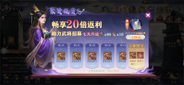 聚贤投资,畅享20倍返利,助力武将招募,7天共送高级招募令*80,聚贤令*10!