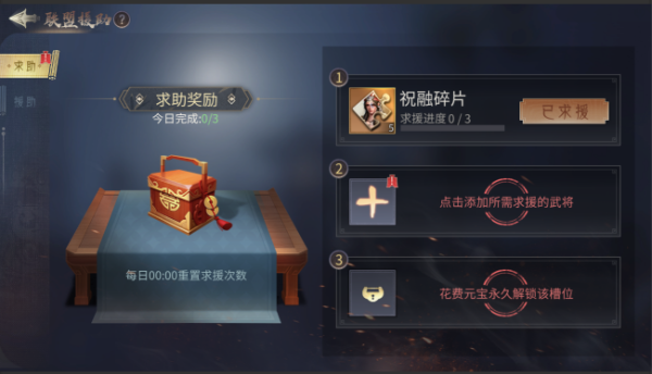 每天可以发起联盟援助,获得自己想要的指定将领的碎片,每日最多可以发起三次,同时玩家可以帮助联盟其他军团的成员