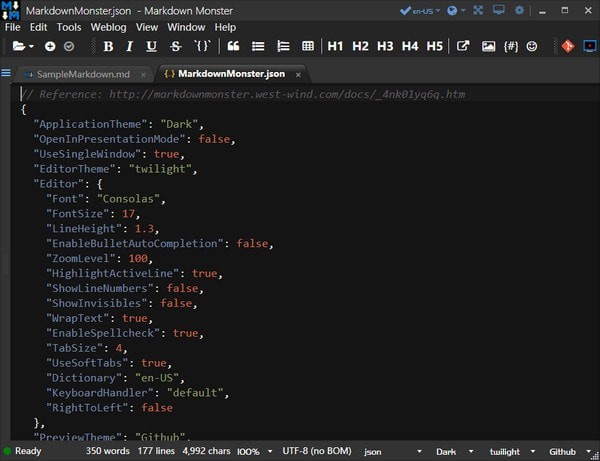 您可以通过保存到磁盘或通过将Markdown选择作为HTML直接复制到剪贴板来导出标记到HTML。HTML预览可以显示大多数常见编码语言的语法着色代码片段,并且可以很容易地用HTML和CSS模板定制以匹配您自己的站点。你可以选择一个明暗的主题,选择单独的编辑器和预览主题。您甚至可以使用VIM或Emacs类型约定。其他方便的特性允许您在内置文件夹浏览器中浏览和选择文件,跳转到资源管理器或终端中的当前文件夹,提交到Git等。