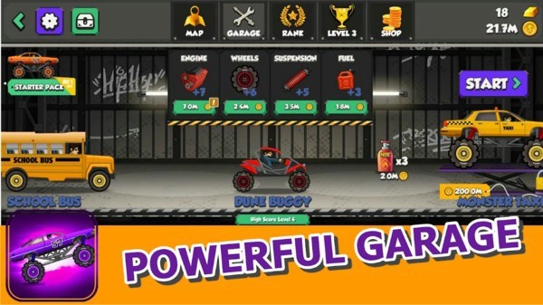 2、可在游戏内玩家可以解锁不同的越野道具以选择不同的发动机让你的越野车有更加出色的性能;