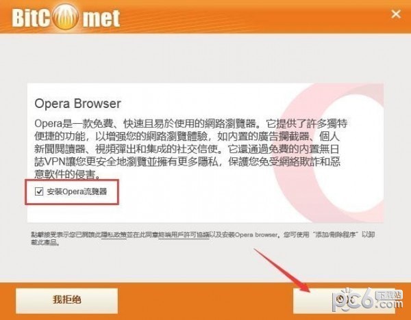 5、如果无需安装Opera浏览器的话,则将图中所示的“安装Opera浏览器”选项单击取消勾选,然后点击右下角的“接受”按钮。