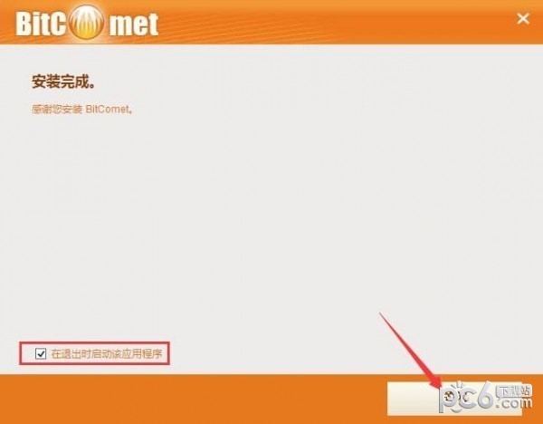 8、如果需要立即使用BitComet比特彗星的话,则单击勾选“在退出时启动该应用程序”,再点击“关闭”按钮即可。