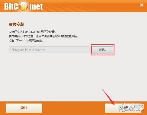 4、点击“浏览”选择BitComet比特彗星的安装目录,此处不建议安装在C盘,如果C盘文件过多的话,会影响计算机的运行速度。选定后点击“下一个”